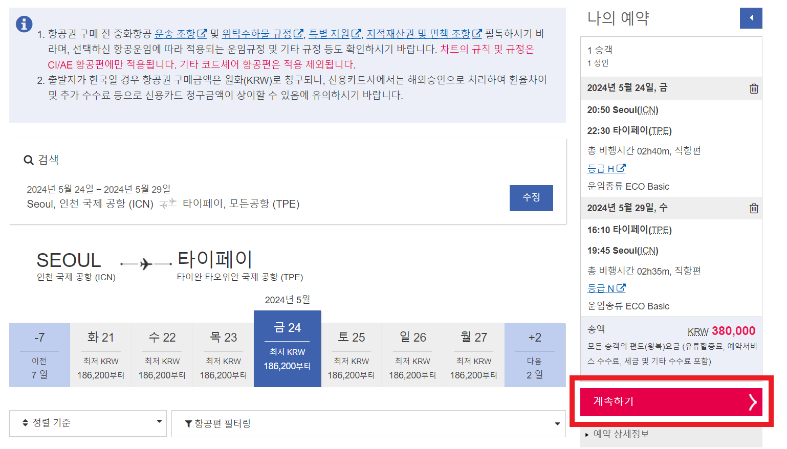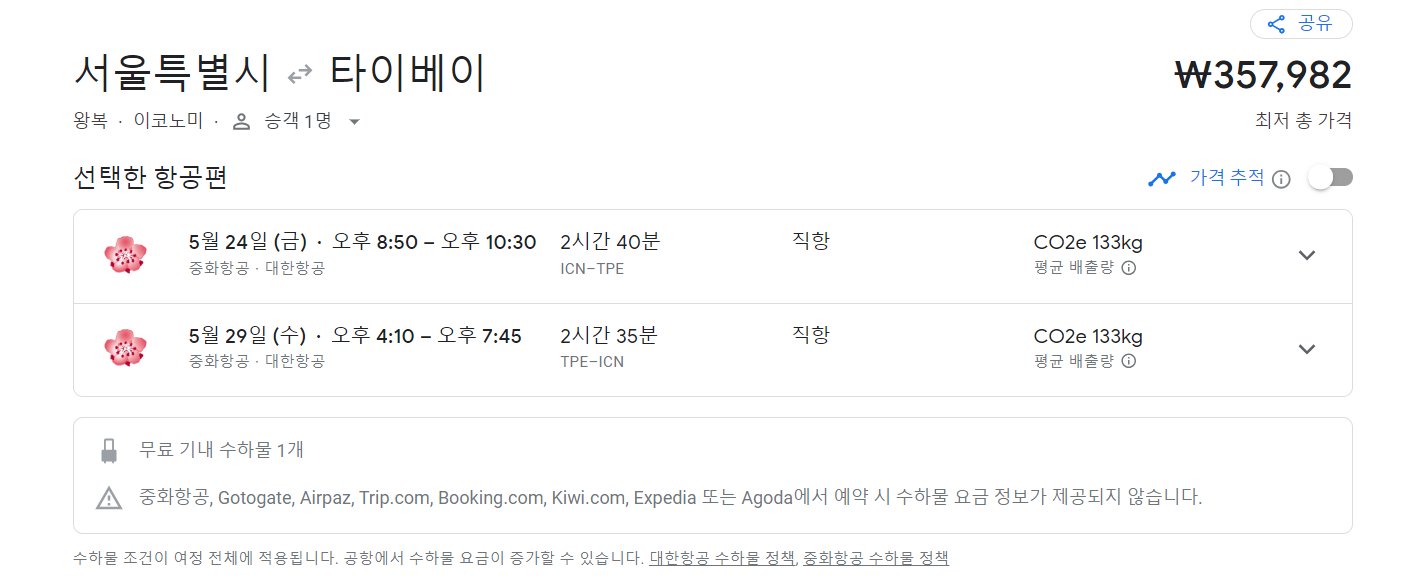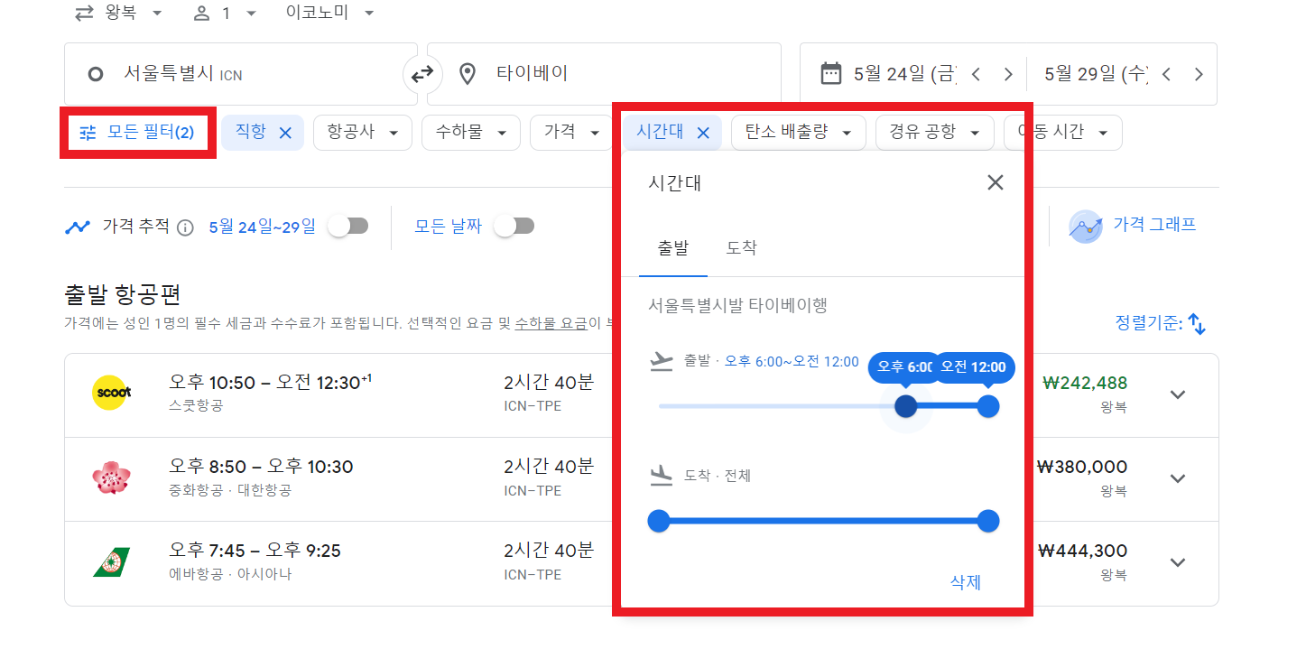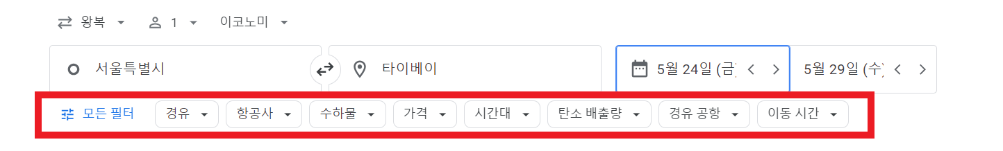 저는 예시로 인천-타이베이, 5월 중 가장 저렴한 5월 24일-5월 29일, 출발은 퇴근시간 이후인 18시 이후로 설정 후 검색해 보았습니다.