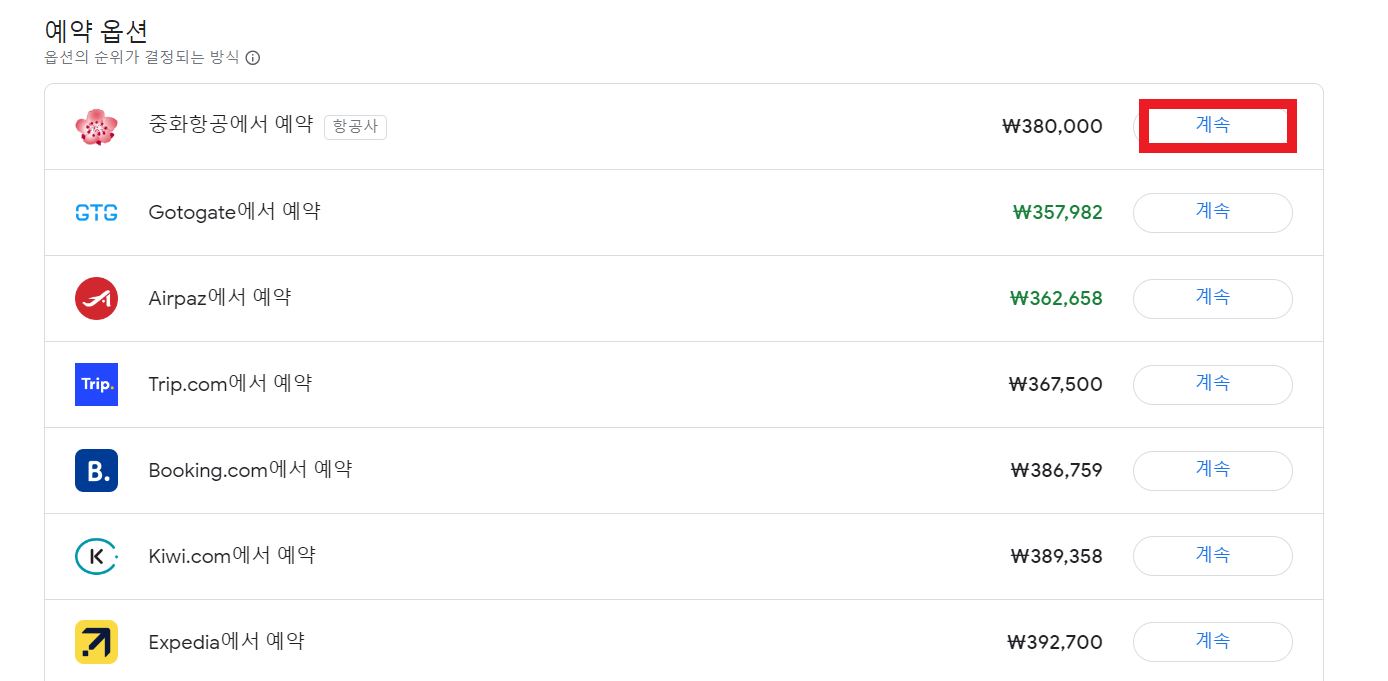 항공권을 선택 하면 예약 옵션에 예약 가능한 다양한 사이트들이 나옵니다.