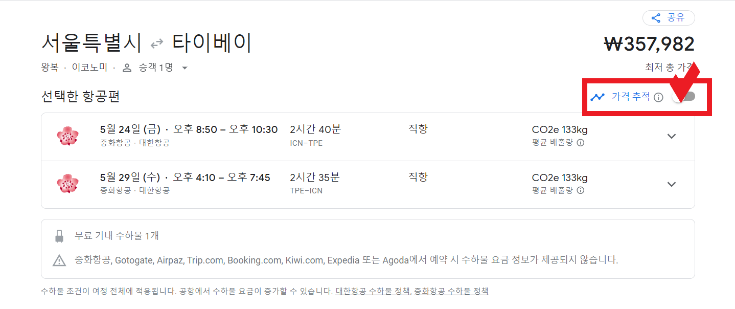 현재 검색한 항공권의 가격 추적 옆에 있는 버튼을 눌러주세요(단 구글에 로그인해야 함)