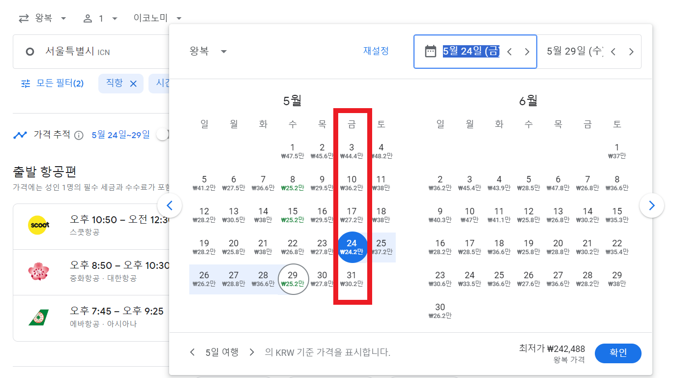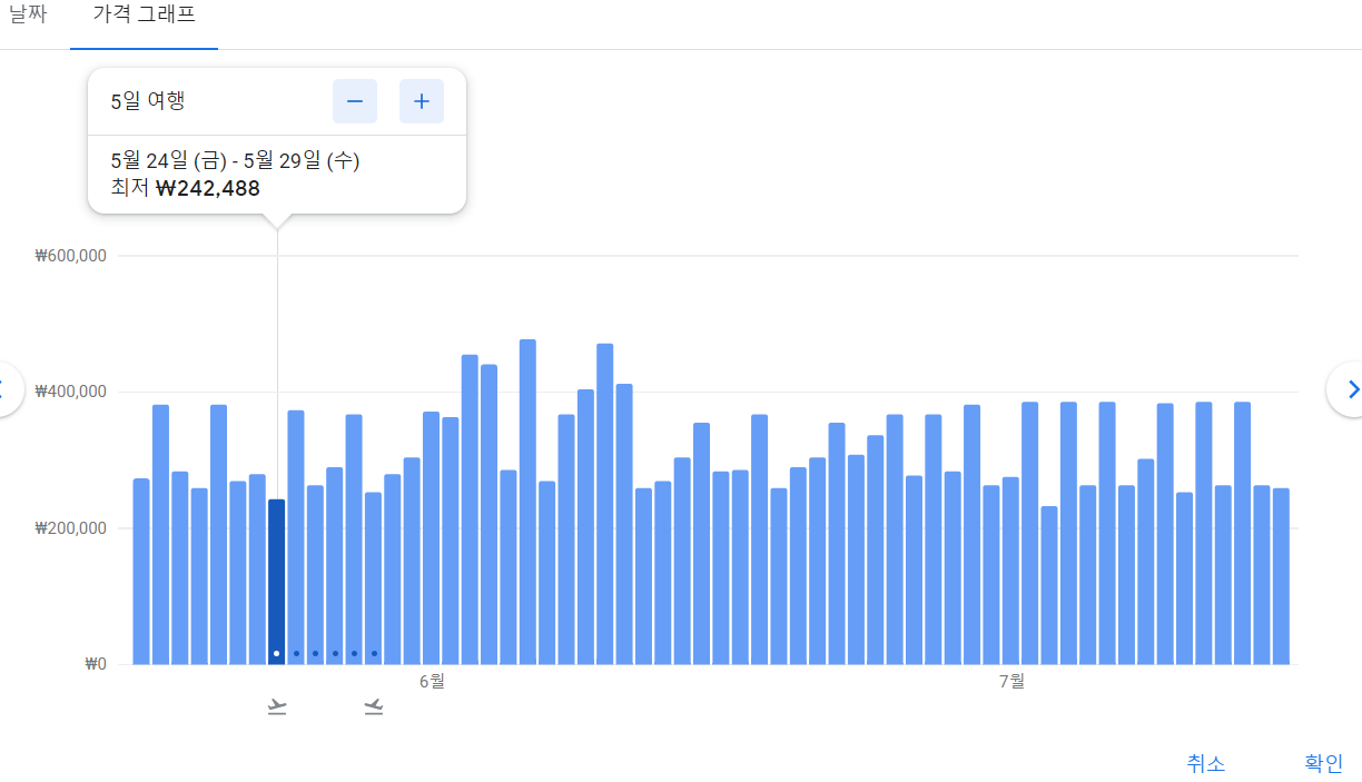 달력이나 가격 그래프를 확인하여 가장 저렴한 날짜에 맞춰 일정을 조율하면 더 저렴한 항공권 예매가 가능합니다.