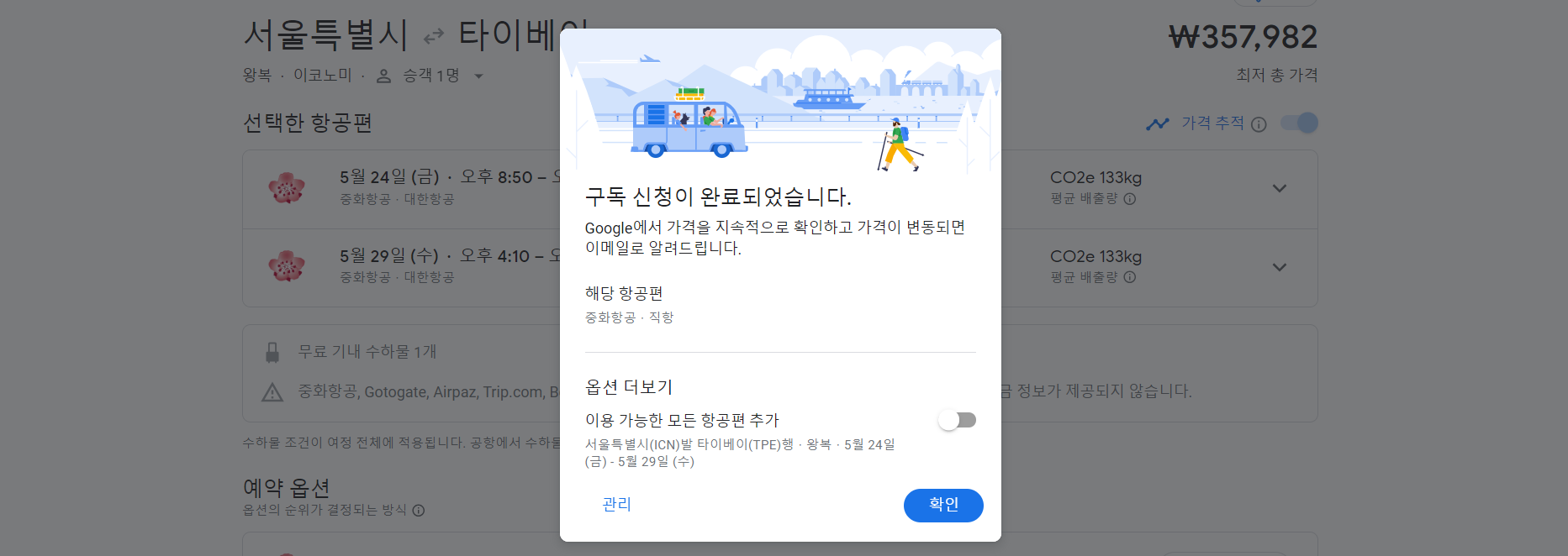 이렇게 알림을 켜 두면 해당 항공편의 가격 변동이 생길 시 내 구글 메일함에 알림이 오기 때문에 매번 사이트에 들어가서 확인할 필요 없이 가장 저렴할 때 구매가 가능합니다.