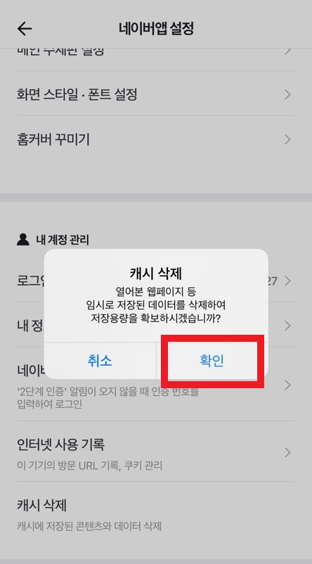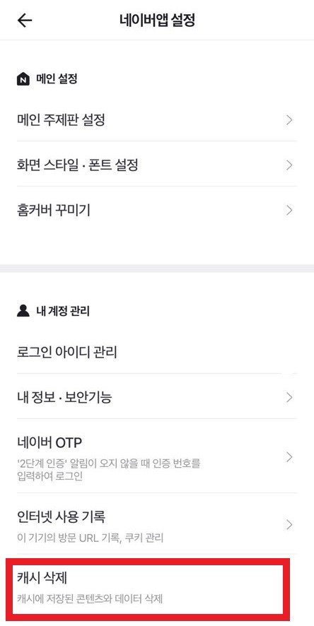 4. 네이버 앱 설정에서 맨 밑 캐시삭제 누르기