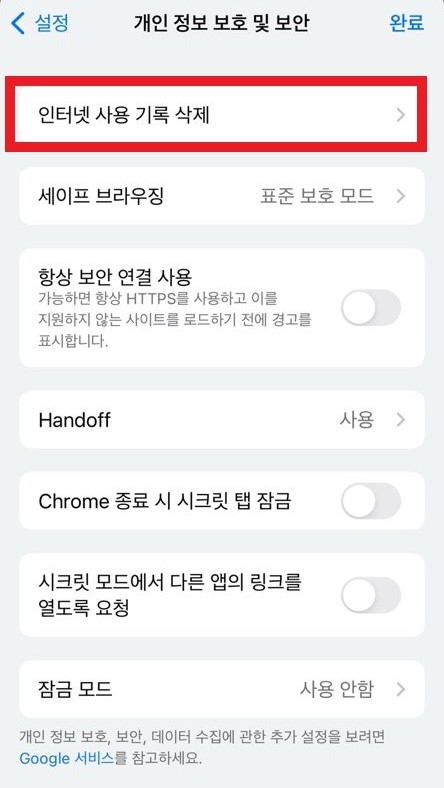 5. 개인 정보 보호 및 보안에서 인터넷 사용 기록 삭제 누르기