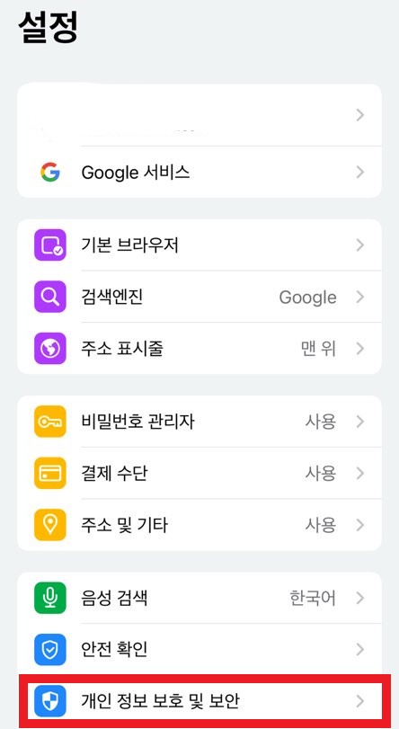 4. 설정에서 개인 정보 보호 및 보안으로 들어가기