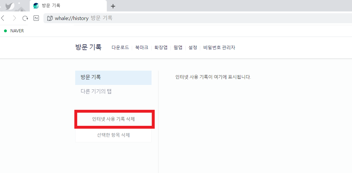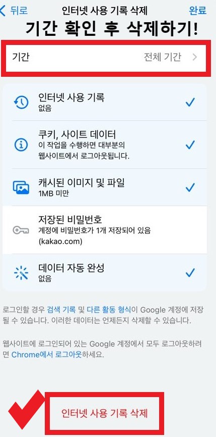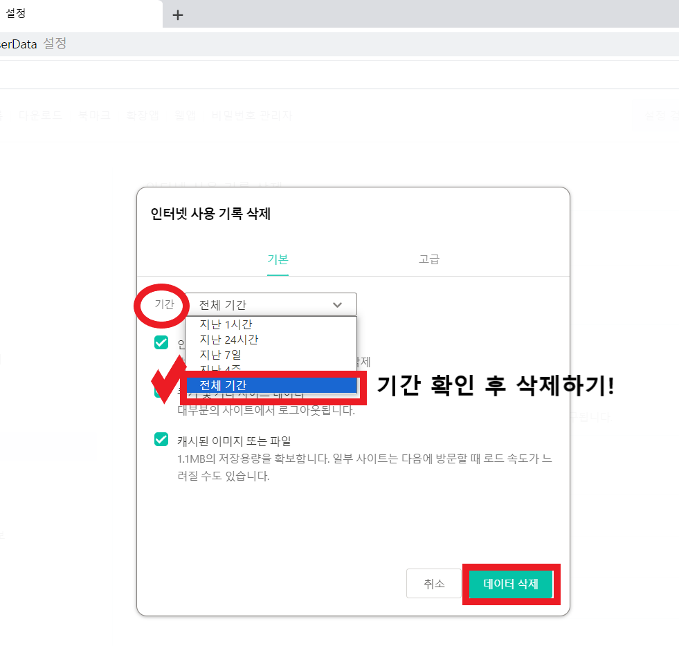 6. 기간을 전체 기간으로 변경 후 인터넷 사용 기록 삭제 누르기