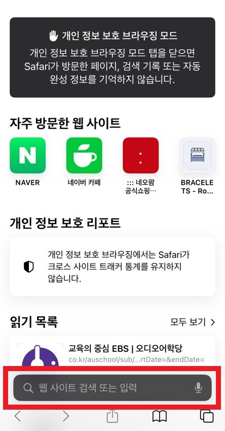 3. 시작페이지 탭을 개인 정보 보호 브라우징 탭으로 바꿔주기